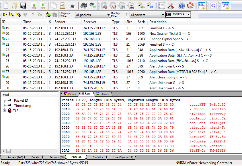 The place to observe the action in Unsniff is in the PDU tab. This may be a little confusing for folks familiar with Wireshark’s link packet based views. What Unsniff does it shows you complete SSL “records” – so an Application Data encrypted record maps cleanly into a “decrypted” record. This is shown with an icon on the left side.